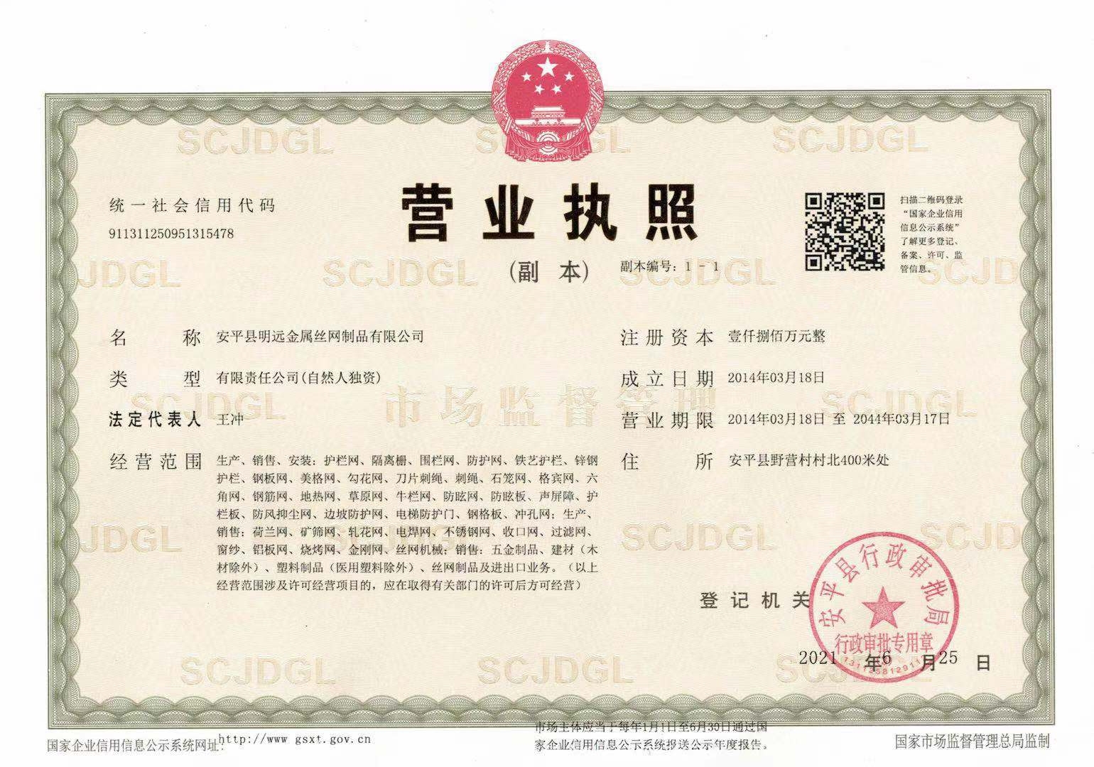 安平縣明遠(yuǎn)金屬絲網(wǎng)制品有限公司 - 座落于絲網(wǎng)產(chǎn)業(yè)基地河北安平,二十年絲網(wǎng)制作經(jīng)驗,是一家從拔絲、焊接、打砂、折彎、鍍鋅、噴塑、浸塑、為成品,生產(chǎn)研發(fā)安裝為一體的交通工程護(hù)欄網(wǎng)、光伏景區(qū)圍欄網(wǎng)專業(yè)型企業(yè)。明遠(yuǎn)公司擁有先進(jìn)的生產(chǎn)設(shè)備,全自動浸塑、噴塑、鍍鋅生產(chǎn)線,電腦焊網(wǎng)機(jī)組,聯(lián)合壓力機(jī),數(shù)控折彎機(jī),槍尖沖孔機(jī)等多臺輔助設(shè)備,具有大批量生產(chǎn)能力。